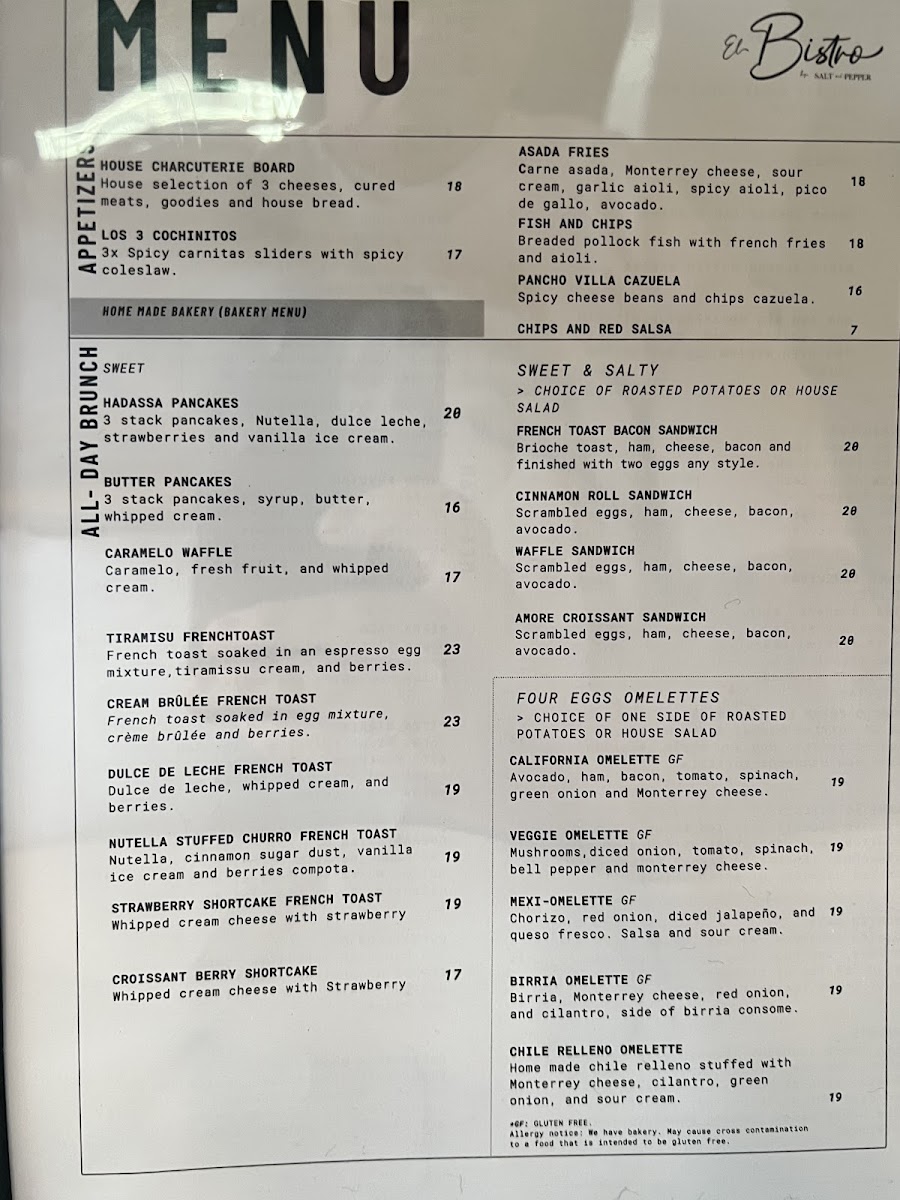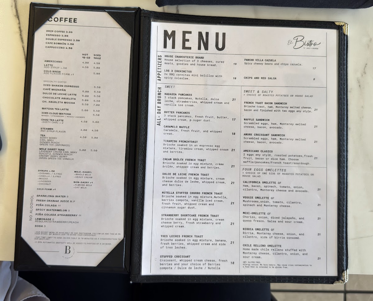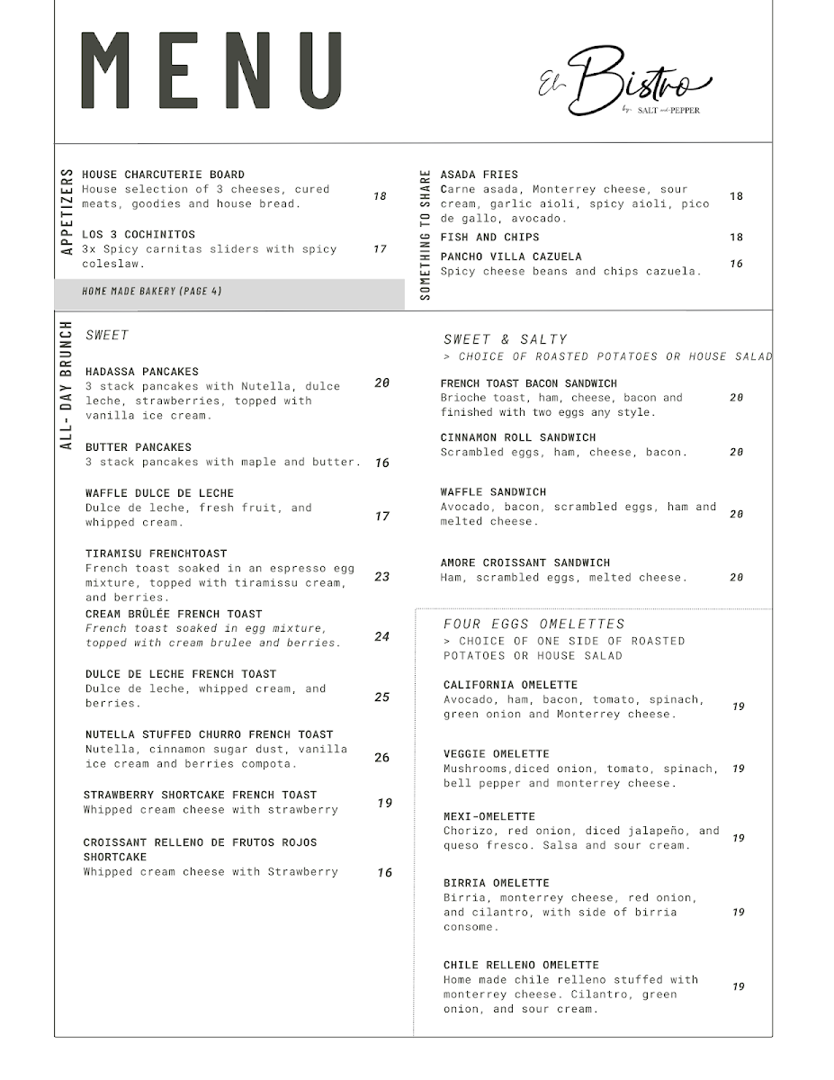 From a reviewer’s perspective, the menu at El Bistro By Salt And Pepper Modesto (901 N Carpenter Rd #18, Modesto, CA 95351) feels like a well-curated summary of what the restaurant does best: bold Mexican-inspired flavors balanced with comforting brunch and café classics. The drink selection sets a fresh and playful tone with options like Spicy Watermelon, Piña Colada Strawberry (Non-Alcoholic), Lemonade Piña Colada (Non-Alcoholic), and Fresh Orange Juice, while the coffee menu-featuring Matcha Tea Latte (Hot 12oz), Cafe Mazapan (Iced 16 Oz), Dulce De Leche Latte (Hot 12oz), Matcha Tea Latte (Iced 16oz), and Iced Cloud Matcha (Iced 16oz)-rounds out the experience with indulgent, modern café favorites. The brunch-focused categories shine, from Mexi-Omelette, Veggie Omelette, California Omelette, Chile Relleno Omelette, and Waffle Sandwich in the Sweet & Salty section, to hearty Mexi-Brunch staples like Huevos Rancheros, Mollete, Chorizo Hash, Chorizo Fried Egg Tacos (2), and Chilaquiles. Health-conscious diners are not overlooked thanks to Keto Costra and Keto Bowl, while lighter bites such as Avocado Bacon Toast With Egg (Any Style), Sweet Cream Cheese And Berries, Avocado Toast Caprese, and Maple Almond Butter Banana offer variety. The menu also confidently steps into savory lunch and dinner territory with Flautas, California Wrap, Queso Fundido Skillet, Quesabirrias, and Flautas Ahogadas (Wet), complemented by fresh salads like Fiesta and Strawberry Walnut. Seafood lovers will appreciate Surf And Turf Tortilla Wrap, Shrimp Tacos, Surf Tortilla Wrap, Fish Tacos, and Fish And Chips, while indulgent sweets such as Fresas Con Crema French Toast, Carlota De Limoncello French Toast, Nutella Stuffer Churro French Toast, Caramelo Waffle, and Dulce De Leche French Toast provide a memorable finish. Add in satisfying burgers and sandwiches like Bacon Chorizo Burger, Bacon Shrimp Burger, Bacon Burger, Bacon Birria Burger, and Caprese, plus crowd-pleasing starters (Pancho Villa Cazuela, Los 3 Cochinitos, Chips And Red Salsa) and kid-friendly choices (Kids Breakfast, Corn Quesadilla, Cheese Mini Pizza, Fries, Rice And Beans), and the menu ultimately feels cohesive, generous, and thoughtfully designed-an inviting conclusion to a diverse and flavorful dining experience.