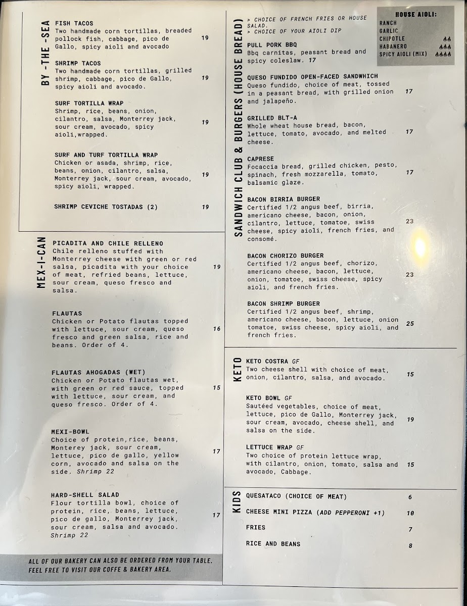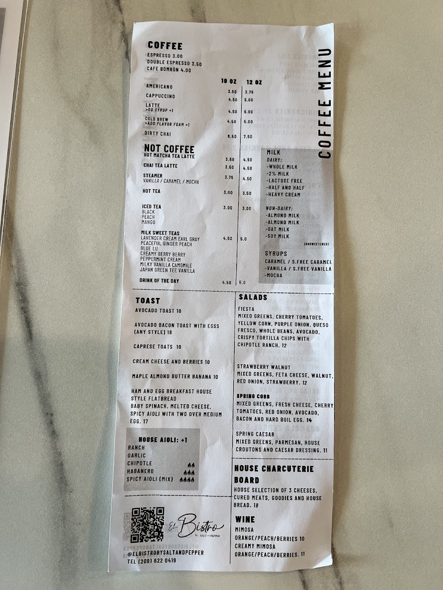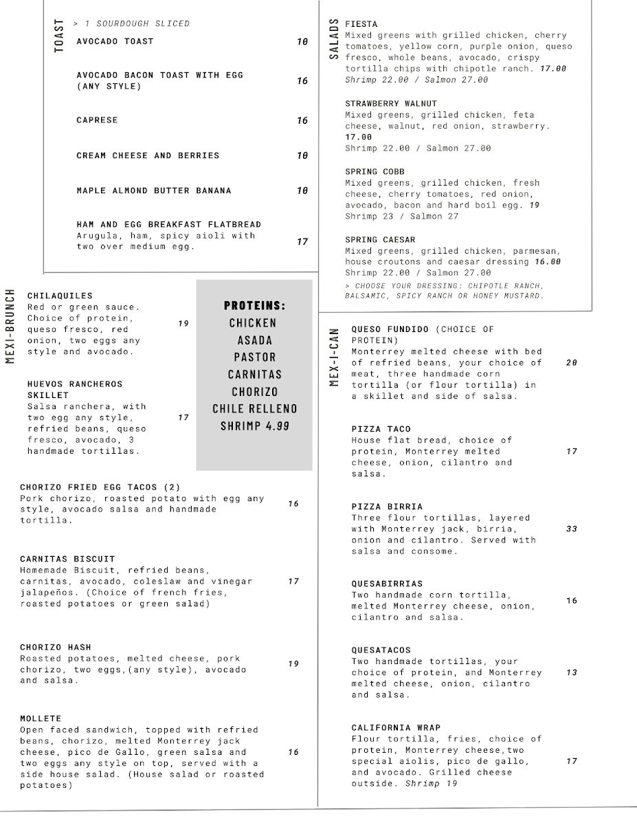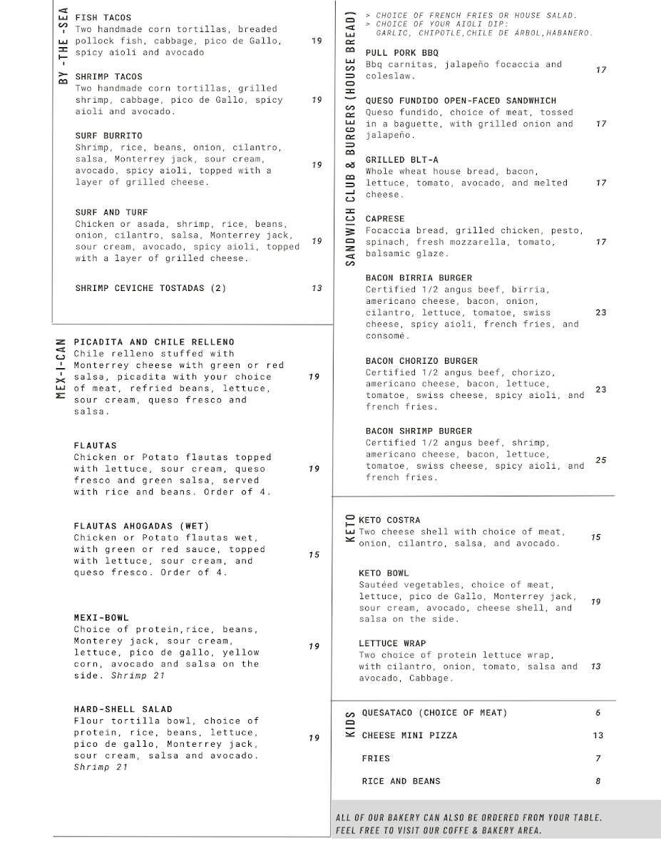 From a reviewer’s perspective, the menu at El Bistro By Salt And Pepper Modesto (901 N Carpenter Rd #18, Modesto, CA 95351) feels like a well-curated summary of what the restaurant does best: bold Mexican-inspired flavors balanced with comforting brunch and café classics. The drink selection sets a fresh and playful tone with options like Spicy Watermelon, Piña Colada Strawberry (Non-Alcoholic), Lemonade Piña Colada (Non-Alcoholic), and Fresh Orange Juice, while the coffee menu-featuring Matcha Tea Latte (Hot 12oz), Cafe Mazapan (Iced 16 Oz), Dulce De Leche Latte (Hot 12oz), Matcha Tea Latte (Iced 16oz), and Iced Cloud Matcha (Iced 16oz)-rounds out the experience with indulgent, modern café favorites. The brunch-focused categories shine, from Mexi-Omelette, Veggie Omelette, California Omelette, Chile Relleno Omelette, and Waffle Sandwich in the Sweet & Salty section, to hearty Mexi-Brunch staples like Huevos Rancheros, Mollete, Chorizo Hash, Chorizo Fried Egg Tacos (2), and Chilaquiles. Health-conscious diners are not overlooked thanks to Keto Costra and Keto Bowl, while lighter bites such as Avocado Bacon Toast With Egg (Any Style), Sweet Cream Cheese And Berries, Avocado Toast Caprese, and Maple Almond Butter Banana offer variety. The menu also confidently steps into savory lunch and dinner territory with Flautas, California Wrap, Queso Fundido Skillet, Quesabirrias, and Flautas Ahogadas (Wet), complemented by fresh salads like Fiesta and Strawberry Walnut. Seafood lovers will appreciate Surf And Turf Tortilla Wrap, Shrimp Tacos, Surf Tortilla Wrap, Fish Tacos, and Fish And Chips, while indulgent sweets such as Fresas Con Crema French Toast, Carlota De Limoncello French Toast, Nutella Stuffer Churro French Toast, Caramelo Waffle, and Dulce De Leche French Toast provide a memorable finish. Add in satisfying burgers and sandwiches like Bacon Chorizo Burger, Bacon Shrimp Burger, Bacon Burger, Bacon Birria Burger, and Caprese, plus crowd-pleasing starters (Pancho Villa Cazuela, Los 3 Cochinitos, Chips And Red Salsa) and kid-friendly choices (Kids Breakfast, Corn Quesadilla, Cheese Mini Pizza, Fries, Rice And Beans), and the menu ultimately feels cohesive, generous, and thoughtfully designed-an inviting conclusion to a diverse and flavorful dining experience.